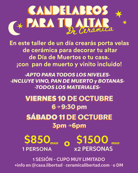 En este workshop podrás plasmar tu arte en un candelabro de cerámica con diferentes técnicas cerámicas y así poder embellecer tu ofrenda, te acompañaremos durante toda la creación de tu piezas además de que disfrutarás acompañadx de buena música, vinitos, pan de muerto y botanas.