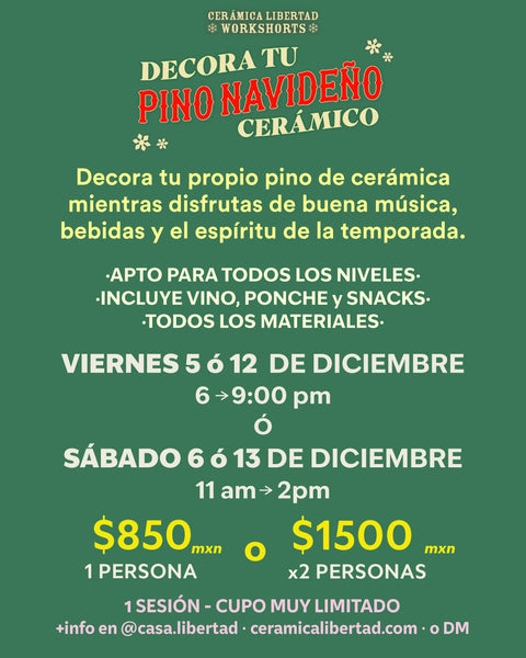 En este workshop podrás plasmar tu arte en un pino de cerámica con diferentes técnicas decoratívas especiales y así podrás dar un toque navideño al espacio que quieras con una pieza hecha por ti, te acompañaremos durante toda la creación de tu piezas además de que disfrutarás acompañadx de buena música, cidras, vinitos y snacks.